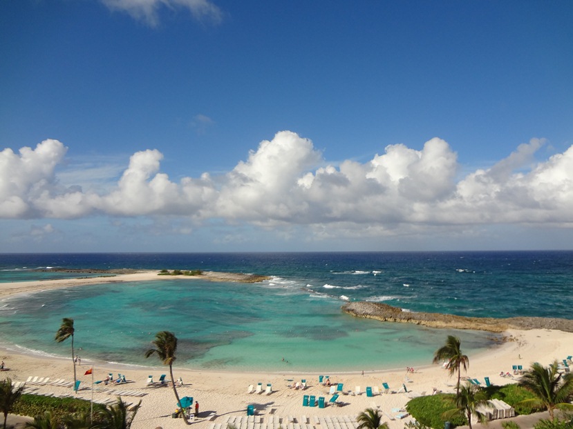 Os olhos são ainda mais recompensados com o azul, o verde, uma mistura excêntrica de tudo isso na tonalidade caribenha e extravagante de suas águas. Apesar de muitas praias, os turistas deixam-se ficar nas preguiçosas facilidades dos Hotéis. Eles se alinham em uma faixa extensa do lado sudoeste da ilha, voltada para a América do Sul, chamada de Palm Beach. Praticamente todos os grandes e maravilhosos Resorts se impõem lado a lado. Todos pé na areia. E que areia!!! Na maioria das vezes, poucos passos são exigidos entre as piscinas dos Hotéis, a areia e o mar. E o sol nem queima tanto assim como no Brasil! Descobrimos que dezembro é uma excelente época para ir, pois não está insuportavelmente quente, nem mesmo apinhado de turistas.